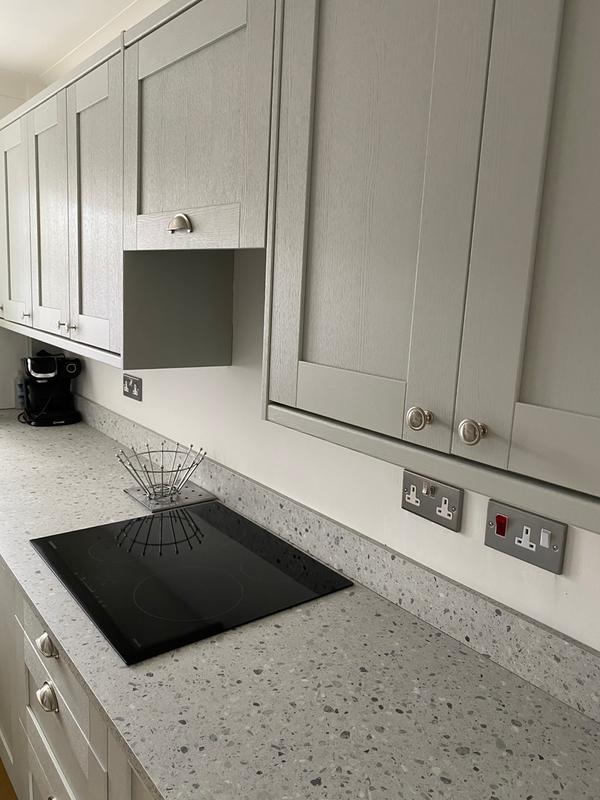 A realistic light grey terrazzo, nuvolento is a laminate worktop that looks and feels like stone composite thanks to lifelike details and a rough texture.